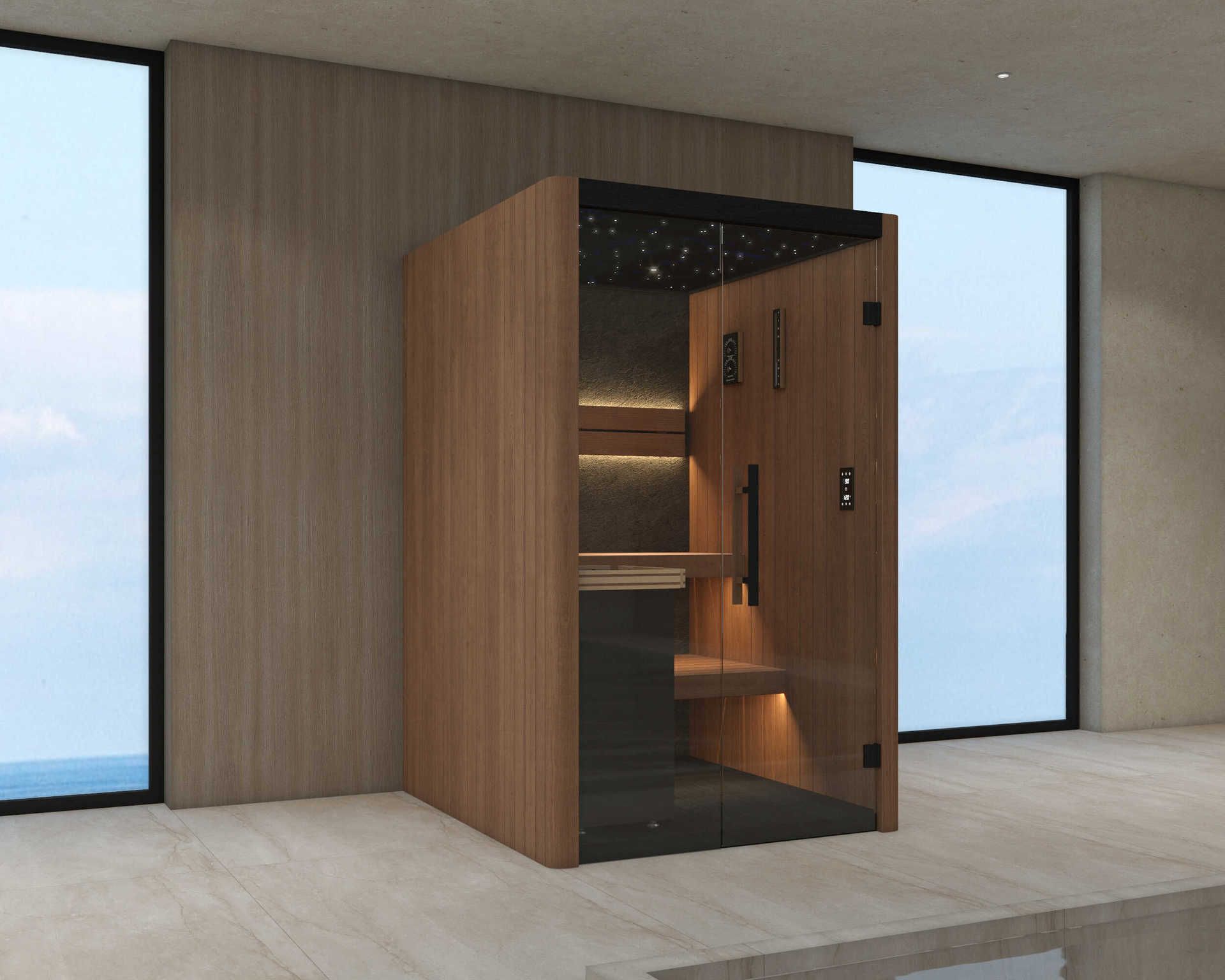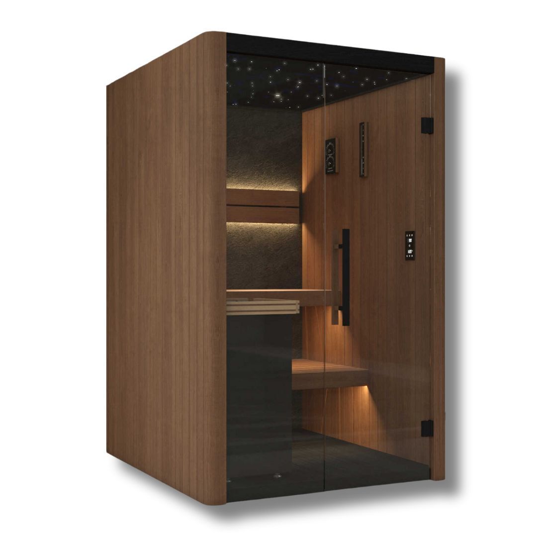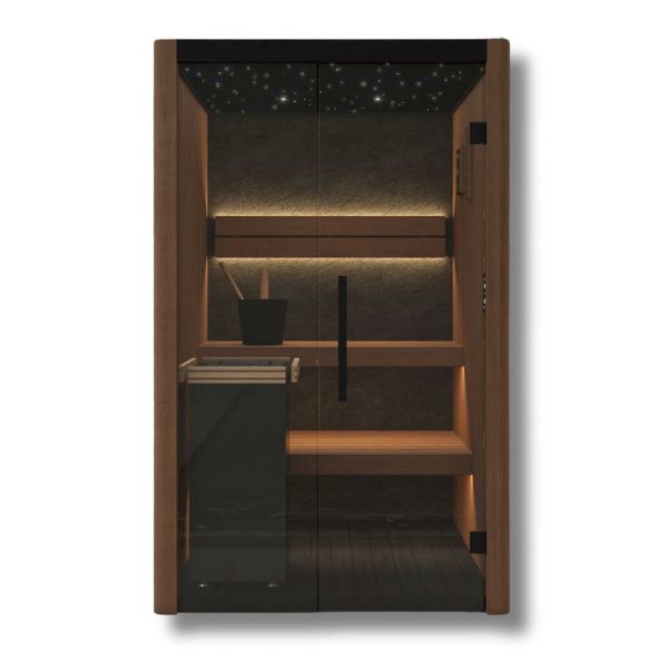 Táto sauna kombinuje moderný dizajn s prvotriednymi materiálmi a premyslenými detailmi. Atmosféru dokonalého pokoja vytvára hviezdny strop s čiernou základňou, ktorý dopĺňa tenký kamenný panel v čiernom odtieni umiestnený na zadnej stene. Spodné časti konštrukcie sú ošetrené Black Sauna Wax, čo zaisťuje elegantný vzhľad i vysokú odolnosť. O príjemné a presné nastavenie teploty sa stará pec HANSCRAFT 4,5kW s inteligentným WIFI ovládačom .