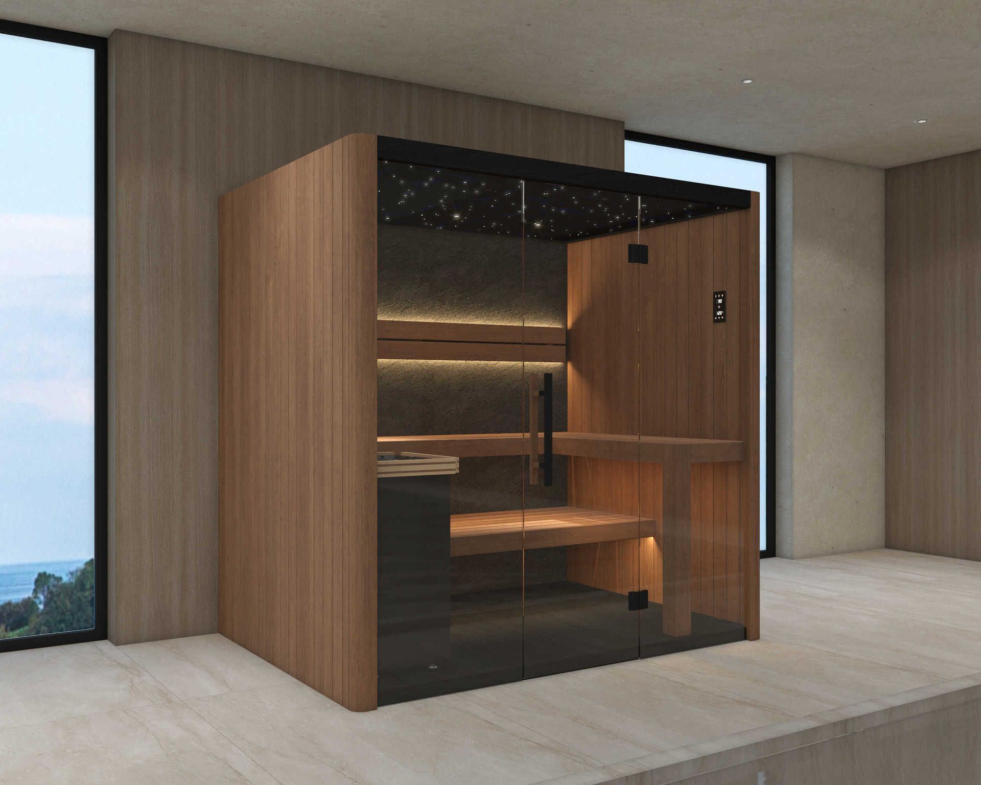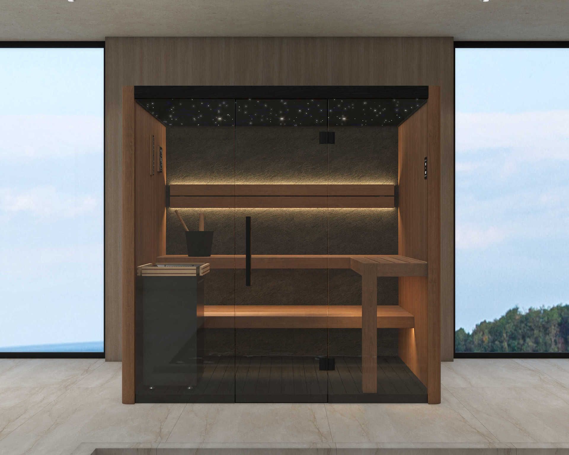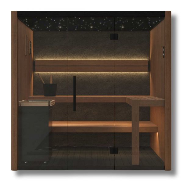 Táto sauna kombinuje moderný dizajn s prvotriednymi materiálmi a premyslenými detailmi. Atmosféru dokonalého pokoja vytvára hviezdny strop s čiernou základňou, ktorý dopĺňa tenký kamenný panel v čiernom odtieni umiestnený na zadnej stene. Spodné časti konštrukcie sú ošetrené Black Sauna Wax, čo zaisťuje elegantný vzhľad i vysokú odolnosť. O príjemné a presné nastavenie teploty sa stará pec HANSCRAFT 6kW s inteligentným WIFI ovládačom .