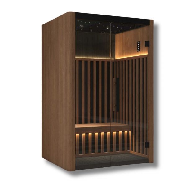 Táto sauna je navrhnutá s dôrazom na modernú estetiku aj maximálny komfort. Dominantou interiéru je hviezdny strop s čiernou základňou, ktorý vytvára atmosféru úplného pokoja. Vonkajšie aj spodné časti sú ošetrené Black Sauna Wax, čo dodáva elegantný vzhľad a zároveň zvyšuje odolnosť materiálu. O jednoduché ovládanie funkcií sa stará PTAT controller, vďaka ktorému je možné prispôsobiť prostredie presne podľa vašich potrieb.