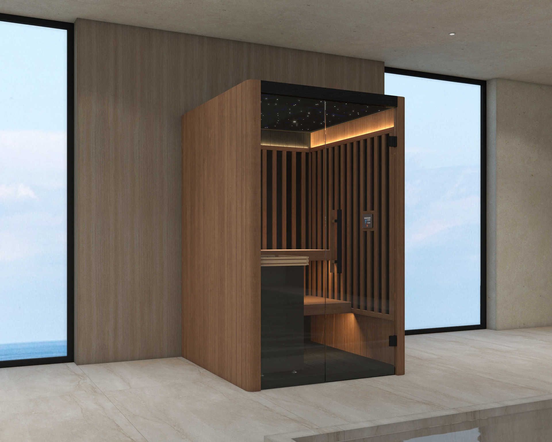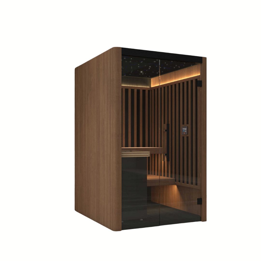 Táto fínska sauna kombinuje tradičné saunovanie s modernými wellness prvkami a doplnkovým infra panelom, ktorý rozširuje možnosti použitia a prináša príjemné hĺbkové prehriatie. Atmosféru dokonalej relaxácie vytvára hviezdny strop s čiernou základňou, ktorého jemné svetlo pôsobí upokojujúcim dojmom. Zadná aj spodná časť konštrukcie je ošetrená Black Sauna Wax, vďaka čomu sauna získava elegantný vzhľad a zároveň lepšiu odolnosť. Pre maximálne pohodlie je súčasťou aj bedrová fyzioterapeutická podložka so softpadom, ktorá poskytuje citeľnú úľavu počas saunovania.