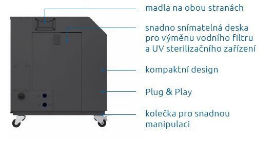 Kaďa je osadená profesionálnym čerpadlom na chladenie aj ohrev vody, vďaka čomu si jednoducho nastavíte ideálnu teplotu počas celého roka – od ľadového ochladenia po príjemne temperovanú vodu. Integrovaný UV sterilizátor spolu s filtračnou jednotkou zabezpečuje krištáľovo čistú a hygienicky nezávadnú vodu bez potreby náročnej údržby.