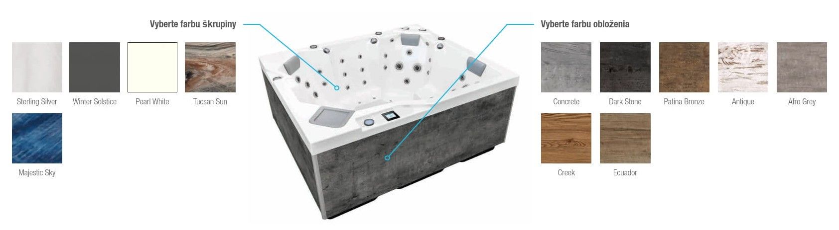 - Trysky: 29 ks hydromasážnych, 10 ks blower (celkom 39 ks)